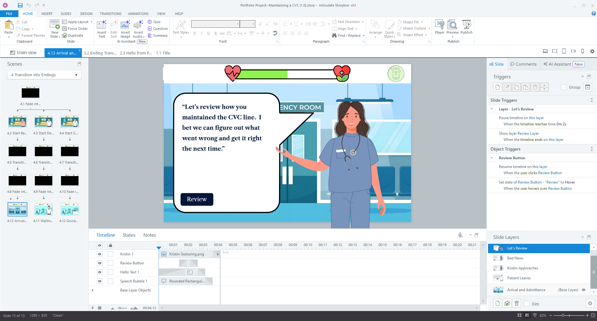 After obtaining all the feedback, I created the entire project. I am particularly proud of the animations and transitions since they required careful manipulation around the timeline combined with the many variables. I used creative, out-of-the-box thinking to create the gauge at the top of the screen with Articulate's slider feature. The last thing that I really enjoyed implementing was the results screen at the very end because my teaching side activated, allowing me to provide meaningful feedback to the audience.