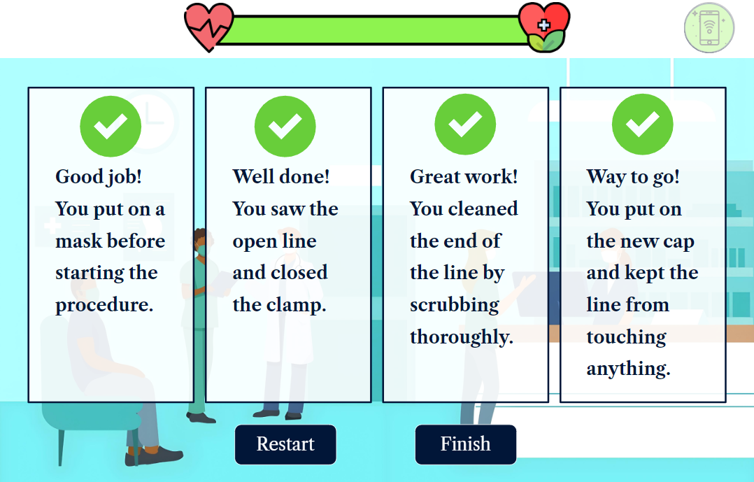When I shared my project with others, it was received well as other instructional designers commended the visual appeal as well as the different endings depending on the learners performance. My personal caretakers mentioned that they wished they had something like this when they were taking care of me. Although this is a conceptual project, the next step would be to implement this project with learners and collect data on their performance, the decrease/increase of caretaker-related infections, and their feedback. I would use this data to edit the project to meet the desired goal more effectively.